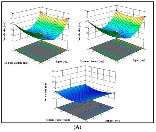 Vesicle size = +178.53 + 3.71A − 0.6525B − 0.0712C − 0.5475AB − 0.9050AC + 0.0925BC + 23.19A2 − 0.9625B2 + 5.53C2