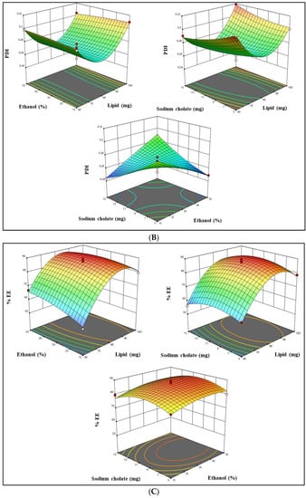 The current study utilized a Box–Behnken design to assess the interactions and effects of formulation-independent parameters at varying levels on three significant quality attributes: vesicle size, PDI, and % encapsulation efficiency (Y1, Y2, and Y3). The experimental results of the Box–Behnken design are summarized in Table 1. The relationship between various independent variables such as phospholipid 90G (mg) (A), Ethanol (%), and sodium cholate (mg) (C), and dependent variables such as vesicle size (nm), PDI, and % EE is illustrated in the 3D graph presented in Figure 1A–C. The quadratic model was found to be the most appropriate fit for all the responses under consideration. The statistical significance of the regression coefficients for the input factors was assessed using the corresponding p-value, which was calculated via analysis of variance (ANOVA) and is reported in Table 2. The utilization of p-values served to assess the statistical significance of each coefficient, thereby facilitating an examination of the underlying patterns of mutual interactions among the chosen process parameters. As demonstrated in Table 2, a p-value of 0.05 or less was considered to indicate that the factor had a statistically significant impact. The model’s adequacy was assessed using the coefficient of determination (R2).