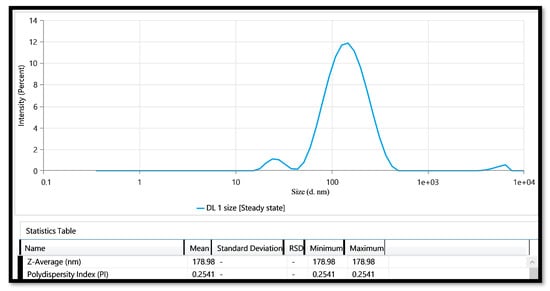 The vesicle size of the optimized HSD-loaded transethosome (Opt-HSD-TE) was found to be 178.98 nm (Figure 2). The dimensions of the vesicles in the formulation are of the utmost significance in facilitating the skin absorption of the drug. Additionally, according to some studies, hair follicles act as long-term drug storage sites, holding drugs that are given topically for up to ten times longer than the SC’s reservoir. The reduced size of nanovesicles enables enhanced skin penetration and accumulation within hair follicles, thereby augmenting their efficacy in targeted drug delivery to specific regions of the skin over an extended period []. The PDI was determined to have a value of 0.254 (Figure 2). The PDI is an indicator of the variability in the size distribution of nanocarriers within a formulation [].