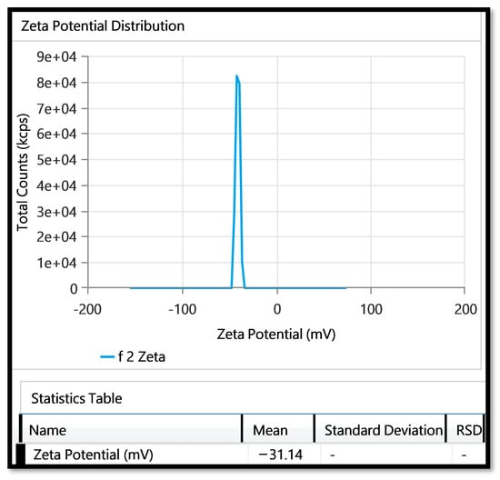 The zeta potential value of the optimized formulation was measured to be −31.14 mV, as depicted in Figure 3. The measurement of the zeta potential provides valuable insights into the stability of the formulation.