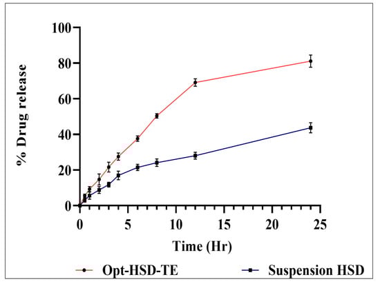 Comparative in vitro drug release of Opt-HSD-loaded TE and HSD suspension.