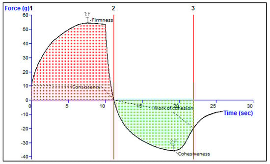 Texture analyses serve the dual purpose of facilitating in-process controls and providing insights into stability (Figure 6). The cohesiveness, consistency, firmness, and work of cohesion were found to be −35.96, 479.56 gm·s, 54.66 gm, and −294.04 g·s, respectively. The pertinent variables encompass consistency, firmness, cohesiveness, and work of cohesion. The term “Firmness” refers to the formulation’s ability to be applied to the skin. The cohesiveness of a gel relates to its ability to recover its structural network and resist deformation after application. Work of cohesion refers to the capacity to adhere to the skin [].