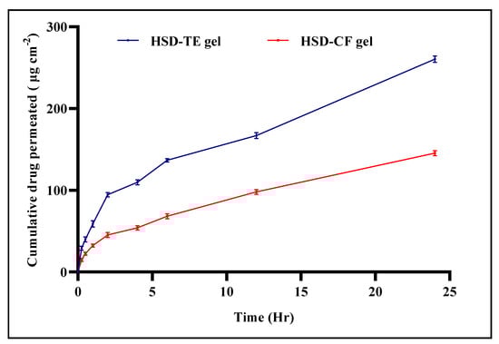 The cumulative amount of drug permeated from Opt-HSD-TE gel was 260.49 ± 0.0187 μg cm−2, and from HSD-CF gel, the amount of cumulative drug permeated was 145.53 ± 0.0076 μg cm−2 via an excised rat skin (Figure 7). It was discovered that the steady-state flux for the HSD-TE gel and HSD-CF gel were 9.62 and 5.4851 μg cm−2 h−1, respectively.