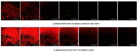 The utilization of confocal microscopy was employed to assess the depth of penetration achieved by both the rhodamine-loaded transethosome gel formulation and the standard solution. The findings of the study indicate that the standard solution exhibited penetration, as evidenced by the detection of a significant fluorescence of dye extending to a depth of 10.0 µm. Following this, the fluorescence intensity gradually decreased and eventually vanished (Figure 8A). In the case of the transethosome gel, it was found that the penetration was absorbed into the deeper layer of the skin, as shown by the existence of transcendent fluorescence that reached an extent of 25.0 µm (Figure 8B).