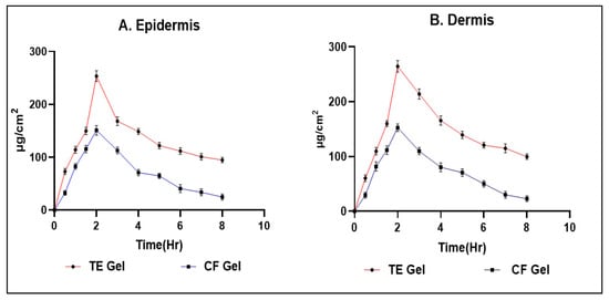 According to the study’s findings, the transethosome gel had higher drug concentrations than the standard formulation at all time periods in both the epidermal and dermal layers of the skin, as shown in Figure 9A,B. According to Table 4’s findings from the analysis, the transethosome gel showed greater Cskin-max and AUC0–8h values than a standard formulation in the epidermal and dermal layers of the skin. The study’s findings showed that the nanovesicle penetrated the skin’s barriers successfully and accumulated in the intended area at a sufficient concentration [].