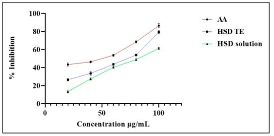 Hesperidin has been shown to have significant antioxidant capacity, with tests demonstrating the agent’s efficacy in scavenging free radicals and preventing lipid peroxidation. Both the free HSD and the optimized HSD-TE formulation were tested for their antioxidant capacities and compared to a standard ascorbic acid solution. Antioxidant activity in ascorbic acid solution, free HSD, and optimized HSD-TE formulation was found to be 86.43 ± 2.37%, 61.30 ± 1.09%, and 79.20 ± 1.77%, respectively (Figure 10). The enhanced antioxidant action of Hesperidin-loaded transethosomes has been found to contribute to the elimination of radicals. The formulation exhibits the capability to enhance the skin’s inherent antioxidant capacity and assist in the mitigation of reactive oxygen species (ROS) and antioxidant activity shown to confer resistance against bacterial growth [,]. The IC50 values of AA, free HSD, and HSD-TE were found to be 42.01 μg/mL, 80.06 μg/mL, and 64.17 μg/mL, respectively.