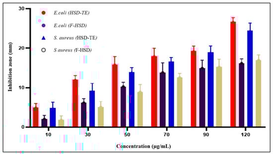 The minimum inhibitory concentration (MIC) was determined as the concentration of antibacterial drugs that effectively suppressed microbial growth after a 24 h incubation period. The technique of disc diffusion was employed to assess free HSD (F-HSD) and HSD-loaded TE. The objective was to ascertain the minimum inhibitory concentration (MIC) of these forms and evaluate their effectiveness in reducing bacterial strains. The experiment involved preparing various concentrations (10 µg/mL to 500 µg/mL) of F-HSD and HSD-TE. The Mueller-Hinton agar medium was employed to inoculate sterile Petri dishes with potentially pathogenic bacterial cultures. Different concentrations of F-HSD and HSD-TE were acquired and subsequently applied onto filter-paper discs. These discs were subsequently positioned on the surface of Mueller-Hinton agar plates. Following a refrigeration period of 2 h at 5 °C, the plates were subsequently subjected to incubation at a temperature of 35 °C for a duration of 24 h. The measurement of inhibition zones was conducted utilizing Vernier calipers, and subsequently, a comparison was made between these measurements [].