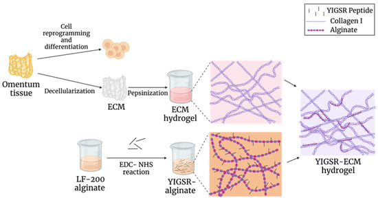 Schematics of the hybrid hydrogel generation. ECM hydrogel was made from omental tissue, which can be easily extracted from patients. Cells and ECM were then separated. Pluripotent stem cells were induced, while the ECM was processed into a thermoresponsive hydrogel. Using carbodiimide activation, YIGSR peptides were conjugated to alginate, which was integrated with the ECM hydrogel to create an ECM-based hydrogel with enhanced mechanical properties and endothelial cell-specific adhesion motifs.