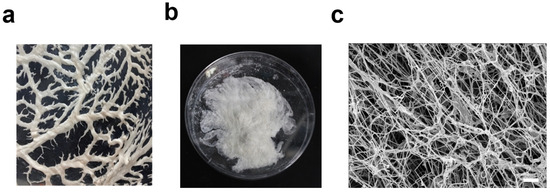 In order to generate the hybrid bioink, native porcine omental tissue (Figure 2a) was decellularized by physical, chemical, and enzymatic processes as previously described [35,37]. The decellularized tissue (Figure 2b) was ground and pepsinized to produce an ECM hydrogel. High-resolution scanning electron microscopy (hrSEM) examination of the ECM hydrogel revealed fibrous nanostructures with an average fiber diameter of 55 ± 0.004 nm (Figure 2c).
