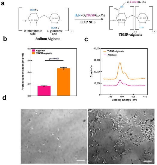 The modification of alginate was achieved via carbodiimide chemistry with 1-ethyl-3-(3-dimethylamino propyl) carbodiimide (EDC) and N-hydroxysulfosuccinimide (Sulfo-NHS) coupling agents [40,41,42]. The modification resulted in amide bonds between the alginate carboxylic groups and amines on the peptide sequence. The schematic synthesis steps of YIGSR-alginate are shown in Figure 3a.