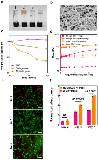 HrSEM examination of the YIGSR-ECM hydrogel showed that the overall fibrous microstructures of the ECM hydrogel were maintained in the ionically and thermally crosslinked hybrid hydrogel. However, the microstructure showed a more entangled organization of the fibers with a polymeric mesh in-between them (Figure 4b). This microstructure enables cells to migrate, proliferate, and differentiate, and can also facilitate the diffusion of oxygen, ions, and metabolites between fibers [43,44,45].
