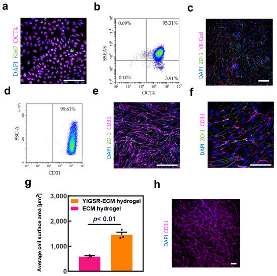 The 2D and 3D culture of iPSC-ECs. (a) Representative microscope image of iPSCs immunostained for key pluripotent stem cell markers (scale bar = 100 μm) (pink: Oct4, green: Ki67, and blue: nuclei). (b) Flow cytometry analysis of iPSCs for pluripotent stem cells markers SSEA-5 and Oct4. (c) Representative microscope image of iPSC-ECs immunostained for key endothelial cell markers (scale bar = 100 μm) (pink: VE-Cadherin, green: ZO-1 and blue: nuclei). (d) Flow cytometry analysis of iPSCs for endothelial cells marker CD31 after sorting. iPSC-ECs on ECM hydrogel (e), and YIGSR-ECM hydrogel (f), immunostained for endothelial cell markers after 2 days in culture (scale bar = 100 μm) (pink: CD31, green: ZO-1 and blue: nuclei). (g) Cell surface area quantification using nucleus count on ImageJ (n = 3). (h) iPSC-ECs encapsulated inside ECM hydrogel immunostained for CD31 after 14 days in culture (scale bar = 100 μm).