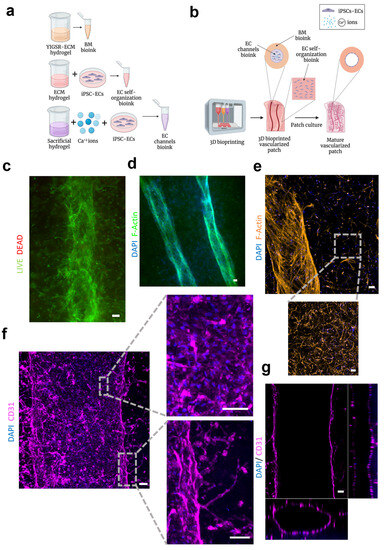 Our goal was to 3D print large blood vessels within the modified hydrogel and small-scale blood vessels within the pristine hydrogel. Therefore, we next investigated the ability of the pristine ECM hydrogel to promote self-assembly of small capillary-like structures. Thus, iPSC-ECs were encapsulated inside the pristine hydrogels and cultured for 14 days. As shown, a network of thin (~10–30 µm) capillary-like vessels was formed inside the hydrogel (Figure 5h).