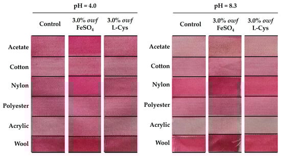 Multifiber dyeing with and without the addition of mordants (3.0% owf FeSO4 and 3.0% owf L-Cys) at pH = 4.0 and pH = 8.3.