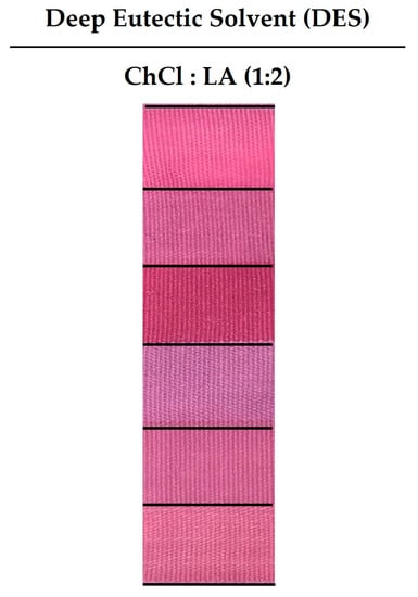 Recently, gel-based DESs have received increasing attention as a promising green alternative to conventional solvents in order to extract specific alkaloid compounds from different sources, namely from plants, like proline/oxalic acid (1:1), ChCl/LA (1:2), and ChCl/Fructose (5:1) [,,]. In addition, gel-based DESs that are prepared from a hydrogen bond acceptor and a hydrogen bond donor, such as ChCl/urea/glycerol and ChCl/ethylene glycol, can act as water-free solvents that are able to dissolve dyes without changing their dyeing properties []. Hence, in this study, the gel-based ChCl/LA (1:2) DES mixture was selected as a dyeing medium for the first time to dissolve the crude gel prodigiosin pigment, a bacterial alkaloid, as it has previously been used to extract alkaloids from plants. According to Figure 4 and Table 4, the multifiber fabric dyed with the crude gel prodigiosin pigment, dissolved using the gel-based ChCl/LA (1:2) DES with pH = 1.7, exhibited different shades. Additionally, the strongest red–pink color was obtained in nylon (K/SNylon_gel-based ChCl/LA (1:2) DES = 3.33). This value was higher that those found for the nylon dyed with the crude gel prodigiosin pigment containing 3.0% owf L-Cys at pH = 8.3 (K/SNylon_3.0% L-Cys_pH = 8.3 = 2.30). Moreover, the ChCl/LA (1:2) DES-based gel, used to dissolve the crude gel prodigiosin pigment, increased the final equalization in the dyeing process of the multifiber fabric, reaching lower dE values for the different fibers (dEAcetate_gel-based ChCl/LA (1:2) DES = 0.02; dECotton_gel-based ChCl/LA (1:2) DES = 0.02; dENylon_gel-based ChCl/LA (1:2) DES = 0.01; dEPolyester_gel-based ChCl/LA (1:2) DES = 0.01; dEAcrylic_gel-based ChCl/LA (1:2) DES = 0.01; dEWool_gel-based ChCl/LA (1:2) DES = 0.01), in comparison with the values obtained for the fabrics that were dyed with the crude gel prodigiosin pigment containing 3.0% owf of L-Cys at pH = 8.3 (dEAcetate_3.0% L-Cys_pH = 8.3 = 0.11; dECotton_3.0% L-Cys_pH = 8.3 = 0.13; dENylon_3.0% L-Cys_pH = 8.3 = 0.05; dEPolyester_3.0% L-Cys_pH = 8.3 = 0.11; dEAcrylic_3.0% L-Cys_pH = 8.3 = 0.11; dEWool_3.0% L-Cys_pH = 8.3 = 0.27).