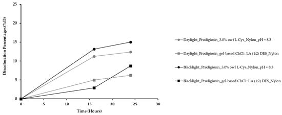 Commonly, colored fabrics after light exposure fade upon the presence of oxygen and humidity. In addition, bacterial or natural pigments exhibit poor light stability in comparison with most synthetic dyes []. Therefore, in this study, the nylon samples that were dyed with the crude gel prodigiosin pigment containing 3.0% owf of L-Cys at pH = 8.3 and using the gel-based ChCl/LA (1:2) DES were directly exposed to blacklight and daylight for 0, 16, and 24 h to accelerate their fading, as shown in Figure 6 through the discoloration percentages (%D).