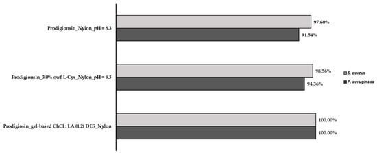 In turn, the obtained results show that the nylon dyed with the crude gel prodigiosin pigment using the gel-based ChCl/LA (1:2) DES presented a superior inhibitory effect on bacterial growth, resulting in an antibacterial efficiency of 100% for S. aureus and P. aeruginosa, when compared to the control group that did not receive prodigiosin dyeing and the use of auxiliaries. The percentage of inhibition of the S. aureus and P. aeruginosa growth is in accordance with the data noticed by Mouro et al., where an inhibitory effect of 100% was observed against S. aureus and K. pneumoniae when nanofibers of polyvinyl alcohol (PVA) were blended with a L-Cys/LA DES containing dissolved wool keratin []. In addition, in the literature, it has been described that ChCl-based DESs improve the antibacterial activity against several Gram-positive and Gram-negative bacteria []. Moreover, LA has been demonstrated to be lethal to microorganisms due to its ability to diffuse to the inside of the cell through the cell membrane and ionize. Also, the acidic pH can result in DNA damage and affect the interactions with the membrane enzymes and proteins, causing changes in the cell membrane structure and permeability, and leading to the leakage of the cellular constituents and cell death [].