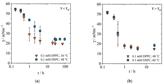 Above Tm, as shown in Figure 3b, significantly lower equilibrium interfacial tensions are established. The course of both PLs overlaps above the respective Tm and shows a strong decrease in the interfacial tension for both phospholipids to γε = 13.7 mN/m for DPPC (c = 0.5 mM) and to 14.3 mN/m for DSPC (c = 0.075 mM), respectively. We hypothesize that the average interfacial tensions of both lipids for c > 0.1 mM equal each other and that the chain length no longer has an effect above Tm, as the increased fluidity and reduced steric hindrance allows lipids to cluster closer together. Thus, the higher PL mobility not only ensures acceleration of the adsorption process, but also a decrease in the minimum interfacial tension. The hypothesis was confirmed with a two-sided t-test for independent samples and with a level of significance α = 0.05. Degrees of freedom (df) for two independent groups was calculated by