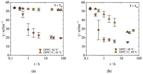 The so-called main transition temperature Tm of the pure PLs and the studied temperatures are listed in Table 5. A temperature of 48 °C was chosen to compare two exact temperatures of both lipids with each other. For DPPC, that temperature is 7 °C above Tm; for DSPC, it is 7 °C below Tm. In addition, a second temperature 5 °C below and above the respective Tm was studied. The chosen temperatures are close to Tm, but not too close to show no effect. Optionally, cholesterol was added to DPPC and DSPC and measured at the same temperatures. The literature reports that for those mixtures, there is no main transition at molar fractions >0.45 for DPPC and >0.5 for DSPC because only a liquid state exists beyond those concentrations [,]. From the transition temperature, it can already be hypothesized that the different chain lengths result in a temperature dependence of the interfacial tension. It was necessary to run time-dependent measurements to determine the quasi-equilibrium of each lipid at each selected temperature in order to subsequently determine the interfacial tension in a concentration-dependent manner.