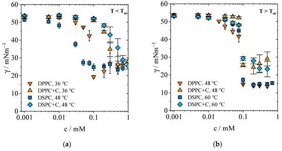 Change in interfacial tension γ versus concentration c of PLs DPPC, DPPC+C and DSPC at different temperatures. (a) Change in interfacial tension below the respective transition temperatures Tm. (b) Change in interfacial tension above the respective Tm.