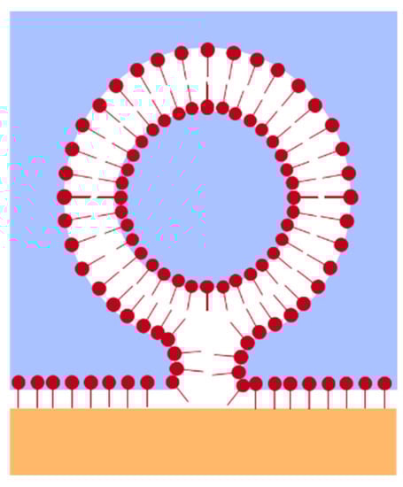 This monolayer surface pressure can be transformed experimentally into the bilayer surface pressure ∏B by the Langmuir–Blodgett and the Langmuir–Schaefer technique, achieving stable bilayers in the surface pressure range of 28–42 mN/m []. As is shown in Table 2, the monolayer surface pressures ∏M are realistic in all cases for the corresponding surface pressures ∏B of the neighboring liposomes. This realistic range of surface pressures provides credibility to the notion that thermodynamic equilibrium is in fact reached and that the monolayer–bilayer equilibrium is established. Our results differ from those reported by Chorlay et al. who found that in the case of droplets of triglyceride incorporated in giant unilamellar vesicles, thus forming local monolayers directly connected to the PL bilayer membrane, the surface pressure ∏M is reduced by about 10% compared to ∏B as measured by the micropipette aspiration technique []. They postulate that this discrepancy is due to the monolayer–triglyceride interaction. This comparison indicates that using a perfluorocarbon as hydrophobic (omniphobic) phase could lead to a better equivalence of ∏M and ∏B—which would need to be confirmed using the micropipette aspiration technique.