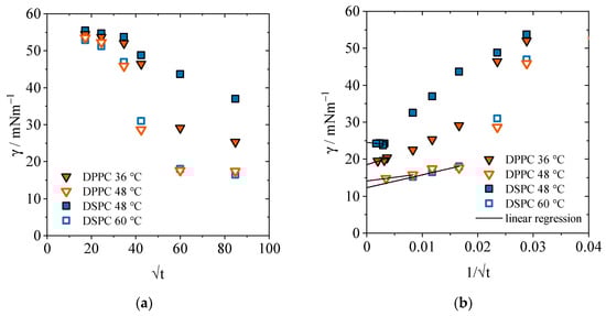 Basically, the area per molecule Amin is determined from the interfacial concentration Γ (cf. Equation (4)). This, in turn, can be calculated in different ways. In the previous section, the interfacial concentration was calculated from the slope of an interfacial tension-concentration diagram using Equation (3). The method is based on ideal diluted solutions and the assumption of a thermodynamic equilibrium which can be questioned for our case of saturation concentration and quasi-equilibrium. The strong slope leads to particularly small areas per molecule. Alternatively, the interfacial concentration can be determined using a time-dependent approach. Li, Miller, and Möhwald follow this approach in calculating the area per molecule and extrapolate the equilibrium interfacial tension []. For this purpose, a time-dependent measurement of the interfacial tension at a given concentration c is used. As a result of the time-dependent calculation method, the diffusion coefficient D is obtained as a characteristic quantity for the adsorption process of phospholipids. According to the diagram in Figure 5a, the measured interfacial tension γ is plotted against . For the PLs DPPC and DSPC, the adsorption process is shown below and above the respective transition temperature and at a concentration of 0.1 mM. The figures for the mixtures with cholesterol can be found in the Supplementary Material (Figure S2). The diffusion coefficient is calculated from the slope , which describes the initial decrease in interfacial tension. Mathematically, the diffusion-controlled adsorption mechanism according to Ward and Tordai is given by