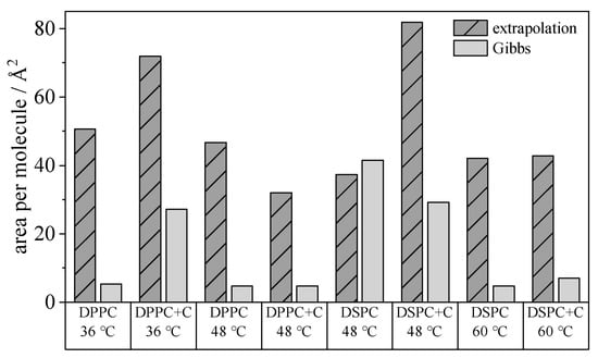 The increased PL interaction of pure lipids at the interface is also mainly reflected in the calculated high Gibbs adsorption isotherms and thus in the very small area per molecule. The results are listed in Table 3. The area per molecule is calculated from the slope according to Equations (3) and (4) with