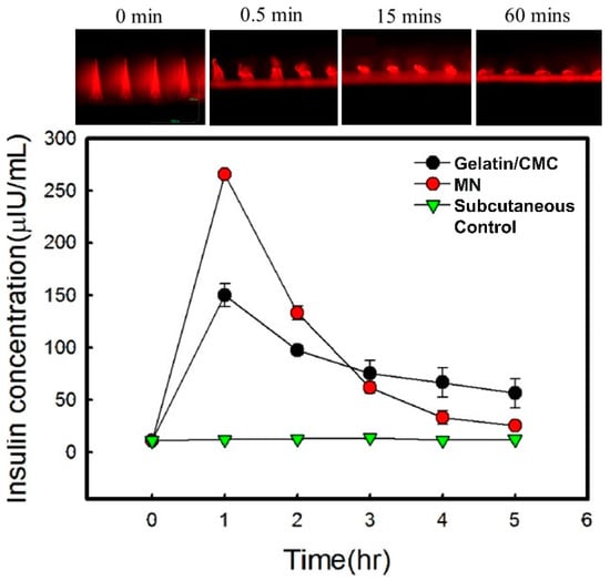 - Lee, I.C.; Lin, W.M.; Shu, J.C.; Tsai, S.W.; Chen, C.H.; Tsai, M.T. Formulation of two-layer dissolving polymeric microneedle patches for insulin transdermal delivery in diabetic mice. J. Biomed. Mater. Res. Part A 2017, 105, 84–93. [Google Scholar] [CrossRef]