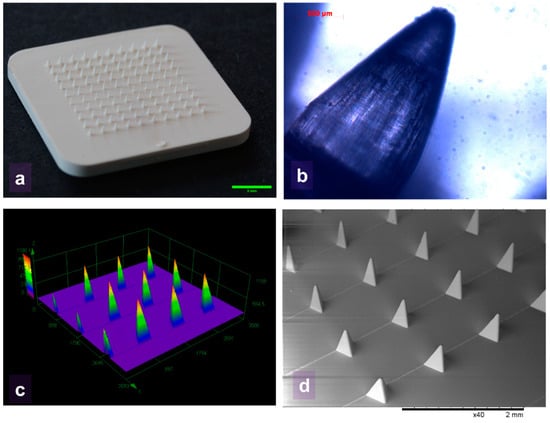 - Allen, E.A.; O’Mahony, C.; Cronin, M.; O’Mahony, T.; Moore, A.C.; Crean, A.M. Dissolvable microneedle fabrication using piezoelectric dispensing technology. Int. J. Pharm. 2016, 500, 1–10. [Google Scholar] [CrossRef]