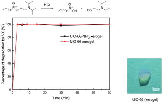 | monolithic UiO-66 xerogel; monolithic UiO-66-NH2 xerogel | 20 mg | VX, 0.4 μL | ≤1.5 min | Liquid-Phase | Catalytic hydrolysis | [105] |