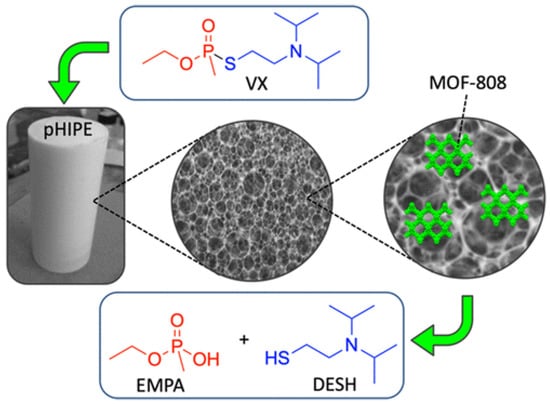 - Kalinovskyy, Y.; Wright, A.J.; Hiscock, J.R.; Watts, T.D.; Williams, R.L.; Cooper, N.J.; Main, M.J.; Holder, S.J.; Blight, B.A. Swell and Destroy A Metal–Organic Framework-Containing Polymer Sponge That Immobilizes and Catalytically Degrades Nerve Agents. ACS Appl. Mater. Interfaces 2020, 12, 8634–8641. [Google Scholar] [CrossRef] [PubMed]