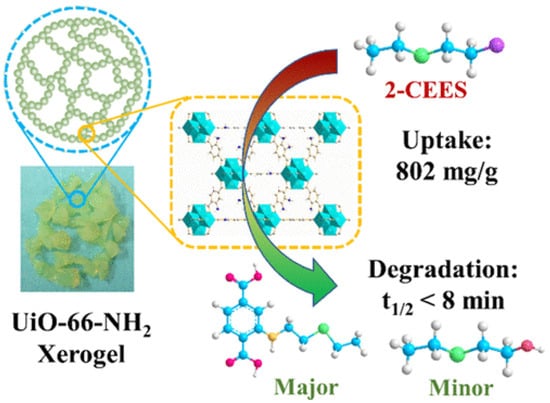 - Zhou, C.; Yuan, B.; Zhang, S.; Yang, G.; Lu, L.; Li, H.; Tao, C.-a. Ultrafast Degradation and High Adsorption Capability of a Sulfur Mustard Simulant under Ambient Conditions Using Granular UiO-66-NH2 Metal-Organic Gels. Acs Appl. Mater. Interfaces 2022, 14, 23383–23391. [Google Scholar] [CrossRef]