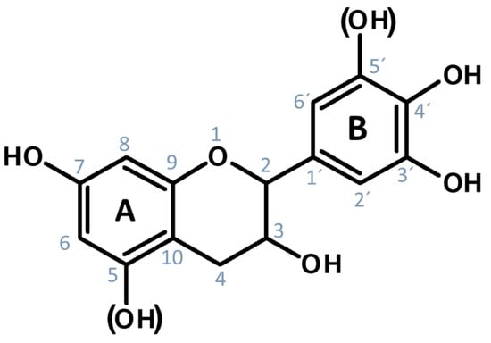 Over the past decades, water pollution with heavy and critical metal ions as well as with organic (textile) dyes has become a worldwide concern. Hence, the treatment of contaminated wastewater is of high importance [,]. Versatile technologies based on physicochemical processes, such as membrane separation [], chemical precipitation [], electrode position [], and adsorption [,,], have been conventionally employed []. However, the mentioned techniques imply high costs and require a high heavy metal ion concentration, except for adsorption, which, in turn, represents a cost-effective technique with ease of operation as well as a high rate of recyclability [,]. Generally, adsorption is achieved by concentrating the adsorbate from a fluid phase onto the adsorbent’s surface or the adsorbent’s pores, and it can be classified into two types, namely, physi- and chemi sorption [,,]. Conventional adsorbent materials include activated carbons [], alumina [], or silica [], however, their generation often requires high processing temperatures [,,,]. In regard to building a circular economy by using eco-friendly materials, natural biopolymer adsorbent materials (referred to as biosorbents) have gained increasing interest in wastewater treatment due to their low costs, ease of processing, and environmental and economic sustainability, as well as their potential for regeneration [,,,]. Among others, tannins, which are low-cost, abundant, natural polyphenols, and are available as waste products from the paper/wood industry, show great potential as biosorbents [,,]. In particular, their ease of conversion into insoluble matrices as well as their natural affinity to ionic dyes and metals in wastewaters benefits their performance as biosorbents [,,]. The metal adsorption mechanism of condensed tannins, whose monomeric flavonoid repetition unit is shown in Figure 1, relies on the presence of the ortho-dihydroxyl group (3′-4′ site) of their B-ring, which chelates in an ion exchange reaction, (metal) ions to the B-rings adjacent hydroxyl groups [,,,]. The structure of the tannins B-ring depicts a vital role in the formation of the metal–tannate complexes, whereas a catechol-type B-ring (two adjacent hydroxyl groups) exhibits a weaker adsorption capacity for ions, compared to a pyrogallol-type B-ring (three adjacent hydroxyl groups) []. This is explained by the stabilization of the chelates in the presence of an additional third hydroxyl group []. Hence, condensed tannins with a pyrogallol-type B-ring, such as mimosa tannin [], are supposed to have higher adsorption capacities.