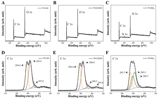Overall survey XPS spectra (A–C) and high-resolution XPS spectra for C 1s (D–F) of the pristine, carboxyl-, and amino-functionalized TH aerogels, respectively.