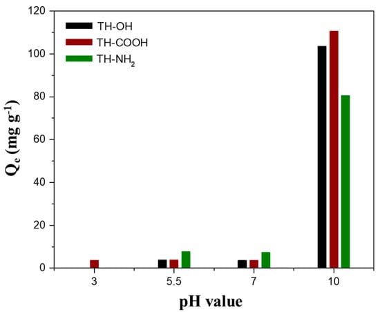 The pH-dependent adsorption capacities (Qe) of the pristine (black), carboxyl- (red), and amino-functionalized (green) tannin biosorbents for the adsorbate zinc with an initial zinc solution concentration of 200 mg L−1.