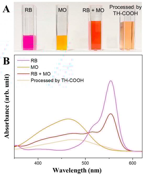 Images of the selective adsorption of RB from the RB/MO solution (pH 11) after two weeks (A) and the corresponding UV-vis spectra of the solutions before and after processing by TH-COOH (B).