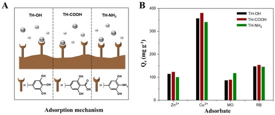 Schematic illustration of the surface functionalization dependent adsorption mechanism (A) and the maximum adsorption capacities (Qe) of the pristine (black), carboxyl- (red), and amino-functionalized (green) biosorbents for the adsorbates zinc ions (Zn2+, pH 10), copper ions (Cu2+, pH 10), methyl orange (MO, pH 3), and rhodamine B (RB, pH 11) at optimal pH conditions (B).