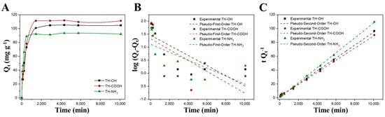 Adsorption kinetic curves for Zn2+ ions at pH 10 (A), pseudo-first-order linear kinetic model (B), and pseudo-second-order linear kinetic model (C) of the pristine (black), carboxyl- (red), and amino-functionalized (green) tannins.