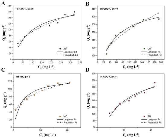 Adsorption isotherms at optimal processing conditions of Zn2+ ions (A), Cu2+ ions (B), MO (C), and RB (D).