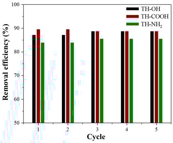 The adsorbents’ regeneration and reuse are of high concern for practical application since a high adsorption capacity and good desorption performance has a favorable impact on the biosorbents overall costs, economic viability, and sustainability of the adsorption-based treatments [,]. Furthermore, the monolithic shape of the prepared tannin gels allows time-efficient recycling using an acidic desorption agent. Precisely, the monoliths feature promising recyclability over five cycles as illustrated in Figure 8 for the recovery of Zn2+ ions with exact recovery values given in Table S4. The removal efficiency of Zn2+ ions from an aqueous solution was constant over the first two cycles and then slightly increased and remained stable for the last three cycles. The increase in removal efficiency can be explained by the experimental setup, as, for starters, a dry monolith was used, which required more time to adjust to the liquid environment. After reaching the full adsorption capacity for zinc ions the removal efficiency remained steady at 89%, 89%, and 85% for the pristine, carboxyl-, and amino-functionalized monoliths, respectively.