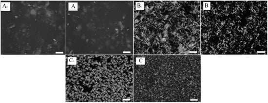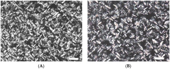 Microphotographs of control and experimental oleogel samples (Figure 1) show no significant changes in the shape and size of the formed crystals. The reason could be the use of ultrasonic treatment without additional external cooling during the crystallization of oleogels, which led to an increase in the temperature of samples (above the crystallization temperature) and, as a consequence, to the melting of crystals. Such an increase in oleogel temperature may have taken place due to the cavitation phenomenon occurring in ultrasonic processing []. The sonication of prepared oleogels influenced the crystals previously formed, which resulted in their destruction and led to the formation of new crystallization centers. However, if complete crystal melting was observed, the effect of new crystalization center formation was minimized. Since oleogels are known to be thermally reversible systems, there was a formation process of crystals identical to the ones in the control sample in all studied samples after sonication (Figure 1). Therefore, for further studies, oleogel samples (A, B, and C) were ultrasonically treated with additional external cooling to prevent crystal melting. The external cooling temperature was empirically selected for each gelator individually: for oleogel A—31 ± 1 °C, for oleogel B—45 ± 2 °C, and for oleogel C—40 ± 2 °C. Microphotographs of oleogels obtained using external cooling with ultrasonic treatment are shown in Figure 2.