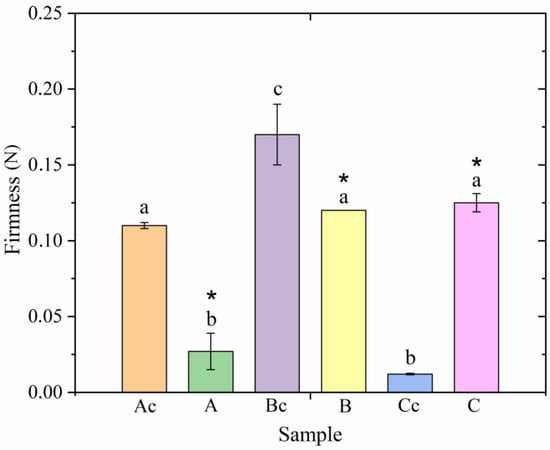 The firmness of the investigated oleogels. The symbol (*) indicates a sample that is significantly different from the control sample within each individual group (p < 0.05). Different letters indicate samples differing from each other (p < 0.05).