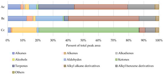 A total of 121 compounds (Supplementary Materials Table S1) were identified, of which 64 have been assigned with CAS numbers, and 57 were identified without isomer type determination. Also, substances with characteristic functional groups and unknown exact structures were used to describe results, and for that purpose, they were grouped as “alkyl alkanes” (24 compounds) and “alkyl benzenes” (27 compounds). Generally, all examined volatile compounds profiles contained such groups as alkanes, alkenes, alkadienes, alcohols, ketones, aldehydes, and terpenoids, along with derivatives of alkanes (alkyl alkanes) and benzene (alkyl benzenes), and in this regard, those profiles were very similar to the volatiles composition of beeswax []. Many of the detected compounds from each group were batches of homologs with 1–2 carbon atoms in difference, and they were very characteristic to the nonvolatile fraction of beeswax as well []. Interestingly, alkyl alkanes of unoxidized wax make just up to 2% of the total weight according to the literature [], but in the studied control oleogel samples, structured with different wax fractions, headspace contained detected alkyl alkanes of 4% (oleogel Cc), 35% (oleogel Ac), and 47% (oleogel Bc) of other identified compounds.