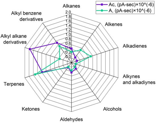 Comparative grouped volatiles profile in oleogels, structured with hydrocarbon’s fraction. Ac—control, A—sample after ultrasound. Units are peak area’s sum × 10−6.