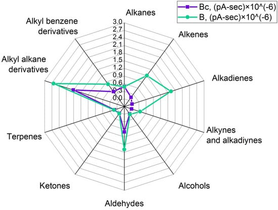 Comparative grouped volatiles profile in oleogels, structured with monoester’s fraction. Bc—control, B—sample after ultrasound. Units are peak area’s sum × 10−6.