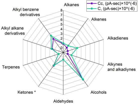 Comparative grouped volatiles profile in oleogels, structured with di- and triester’s, free fatty acid’s and free fatty alcohol’s fraction. Cc—control, C—sample after ultrasound. Units are peak area’s sum × 10−6 except for ketone group. *—ketone group here is peak area’s sum × 10−7.