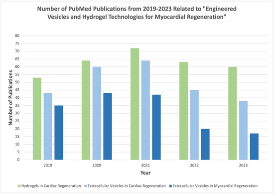 Interestingly, the regenerative potential of cells largely depends on secretory vesicles or EVs’ cargo (RNAs, proteins, surface receptors, proteins, and transcription factors) carriers distinct from one another. Translationally, EVs can be modified to alter their targets, carrying molecules, and trafficking [3,4]. EV-based communication between neighboring cells is crucial in maintaining integrity and morphology, increasing their potential therapeutic effects. Recent studies unveiled the healing responses of EV-derived communication facilitated by decreased fibrosis, improved cardiac function, reduced oxidative stress, and accelerated myocardial regeneration [4,5,6] (Figure 1). Translationally, the application of EVs requires an ideal delivery system to sustain the therapeutic dose at the infarct zone, which depends on hydrogel systems. Notably, the recent advancements in hydrogel technologies, including phase separation [7], electrospun nanogels [8,9], and polymer technology/engineering [9], promise the next-generation regenerative cardiology. The information regarding hydrogel-based EV delivery to the myocardium is minimal; however, there is an increased trend in the research outcomes along this aspect (Figure 2). This review article focuses on EV engineering and hydrogel technology in myocardial healing following MI.