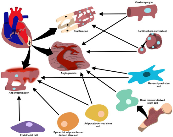 One study by Lambert et al. showed that EVs secreted by epicardial adipose cells showed higher levels of VEGF and reduced COL18A1, demonstrating the angiogenic potential of these cells [52]. Another study by Ozkaynak et al. observing the myocardial regenerative capacity of EATDS found that these cells demonstrated an increase in vascular density and a clinically significant increase in ejection fraction [50]. Additionally, EATDS appear to play a role in cell differentiation [32]. Yang et al. showed that EVs derived from these cells demonstrated adipogenic capabilities [50]. Exosomal–ribosomal proteins have been investigated for their effectiveness in modulating EATDS, revealing their pro-inflammatory, anti-inflammatory, proliferative, and non-proliferative properties, suggesting their cardiac regeneration potential [51]. Similar to BMSCs, it is unclear whether the reparative properties of these cells are due to the paracrine signaling of neighboring cells [50]. A summary of all the previously discussed cell types and their relationships can be found in Table 1 and Figure 3. Their promise as potential therapeutic targets warrants further investigation.