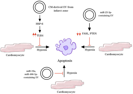 EVs isolated from hypoxic cells exhibited increased amounts of miR-125b-5p, which improved left ventricular function on delivery into the myocardium immediately post-MI and decreased the infarct size [59]. Additionally, the inhibition of apoptosis was observed following the transfer of miR-19a via MSC-EVs in a rat model [60]. Furthermore, EVs containing miR-25-3p, which targets pro-apoptotic genes FASL and PTEN, and miR-486-5p inhibited apoptosis and increased myocardial repair post-injury, as seen in Figure 4 [61,62]. Also, Atorvastatin-treated MSC-EVs inhibited apoptosis and decreased pro-inflammatory signaling following MI [60].