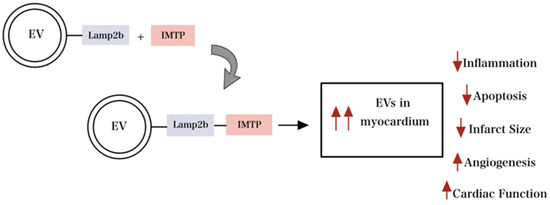 Furthermore, Zhu et al. demonstrated that modified EVs with Cyclo (Arg-Gly-Asp-D-Tyr-Lys) (c(RGDyK)) targeting ligand provided excellent Paclitaxel (PTX) drug delivery to glioblastoma cells by crossing the blood-brain barrier [75]. Similarly, EV-mediated signaling during pathogenesis and homeostasis of heart disease in cardiovascular research has been well documented and is a focus for therapeutic delivery [72]. Wang et al. reported that fusing ischemic myocardium-targeting peptide (IMTP) to Lamp2b (IMPT-Lamp2b) resulted in the accumulation of the engineered EVs in the ischemic myocardium, depicted in Figure 5. Thus, through specific targeting, engineered EVs suppressed inflammation and CM apoptosis, promoted angiogenesis, decreased infarct size, and improved cardiac function [17].